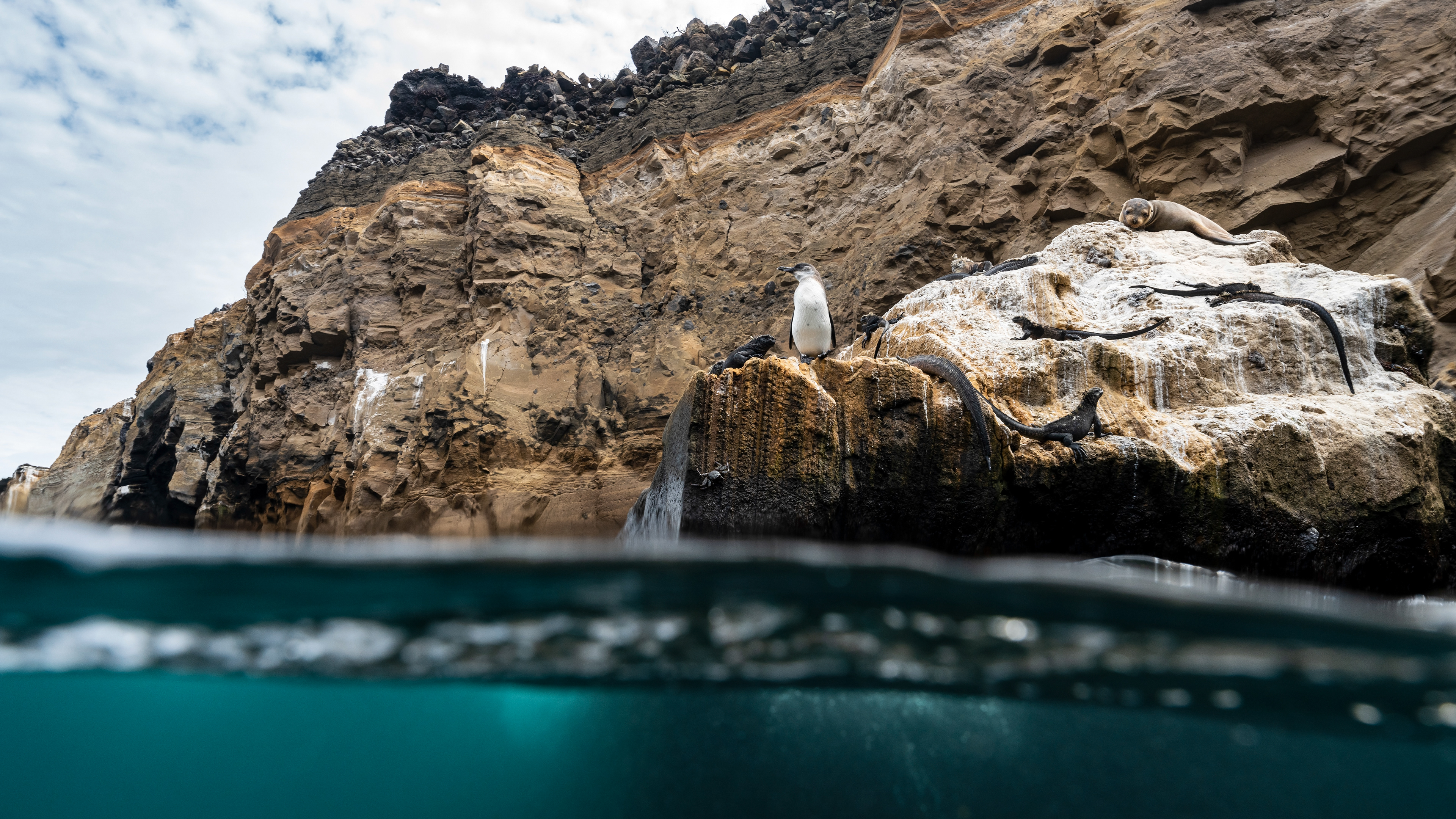 Marine Iguana (Amblyrhynchus cristatus), Galápagos sea lion (Zalophus wollebaeki) and Galápagos penguin (Spheniscus mendiculus) at Isabela